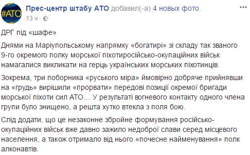 В частности, к передовым позициям сил АТО, оборону которых обеспечивали украинские морские пехотинцы, приблизились представители так называемого 9-го отдельного полка морской пехоты российско-оккупационных войск и попытались "прорвать" передовые позиции отдельной бригады морской пехоты сил АТО.