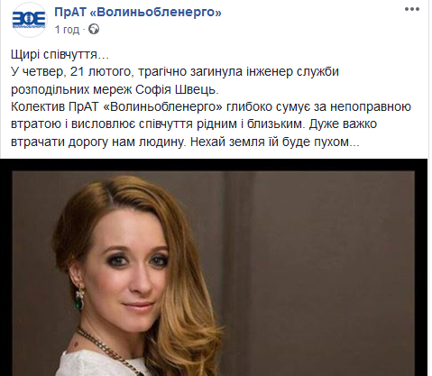 Погибшей в трагической аварии оказалась София Швец - инженер службы распределительных сетей ЗАО "Волыньоблэнерго".