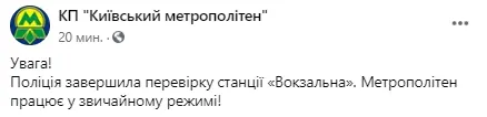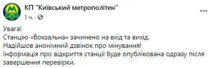 "Станцию метро Вокзальная закрыли на вход и выход. Поступил анонимный звонок о минировании. Информация об открытии станции будет опубликована сразу после проверки", - говорится в сообщении.