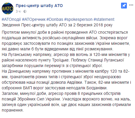 В результате обстрелов один украинский военный погиб, еще двое получили ранения.