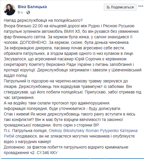 "Сорочик утверждал, что его избили полицейские. На водителя составили протокол об админнарушении, по факту избиения патрульного открыто уголовное производство по ч.2 ст. 346 УК "Угроза или насилие в отношении государственного или общественного деятеля", - сообщила Балицкая.