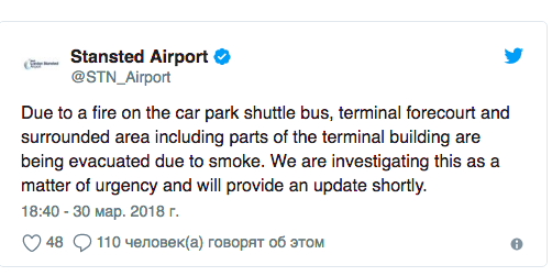 В лондонском аэропорту Станстед в пятницу, 30 марта, произошел пожар. Об этом сообщила администрация воздушной гавани в соцсети Twitter.