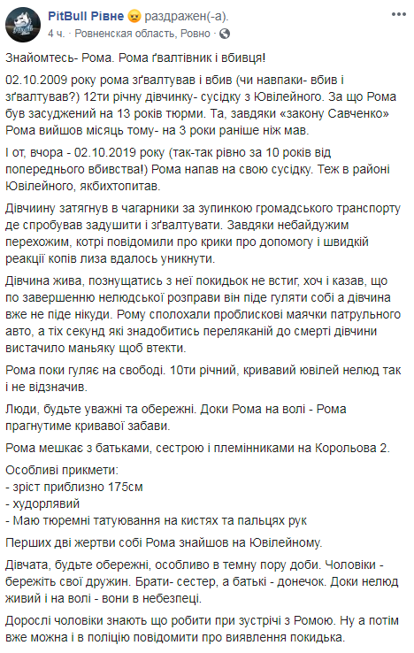 Насильник-рецидивист напал на девушку в Ровно. Об этом сообщили в PitBull Ровно на странице в Facebook.