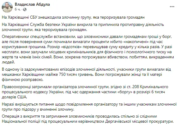 Глава пресс-центра СБУ в Харьковской области Владислав Абдула заявил, что сотрудники ведомства совместно со следователями Нацполиции под процессуальным руководством Дергачевской местной прокуратуры разоблачили и пресекли деятельность группировки, вымогавшей деньги у местных жителей. Об этом он сообщил на своей странице в Facebook.