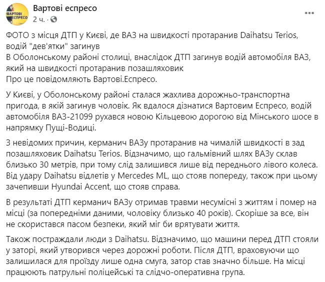 Дорожно-транспортное происшествие случилось в Оболонском районе города. Согласно предварительным данным, владелец машины ВАЗ 21099 во время движения по Кольцевой дороге в сторону Пуща-Водицы на скорости влетел в машину Daihatsu Terios.