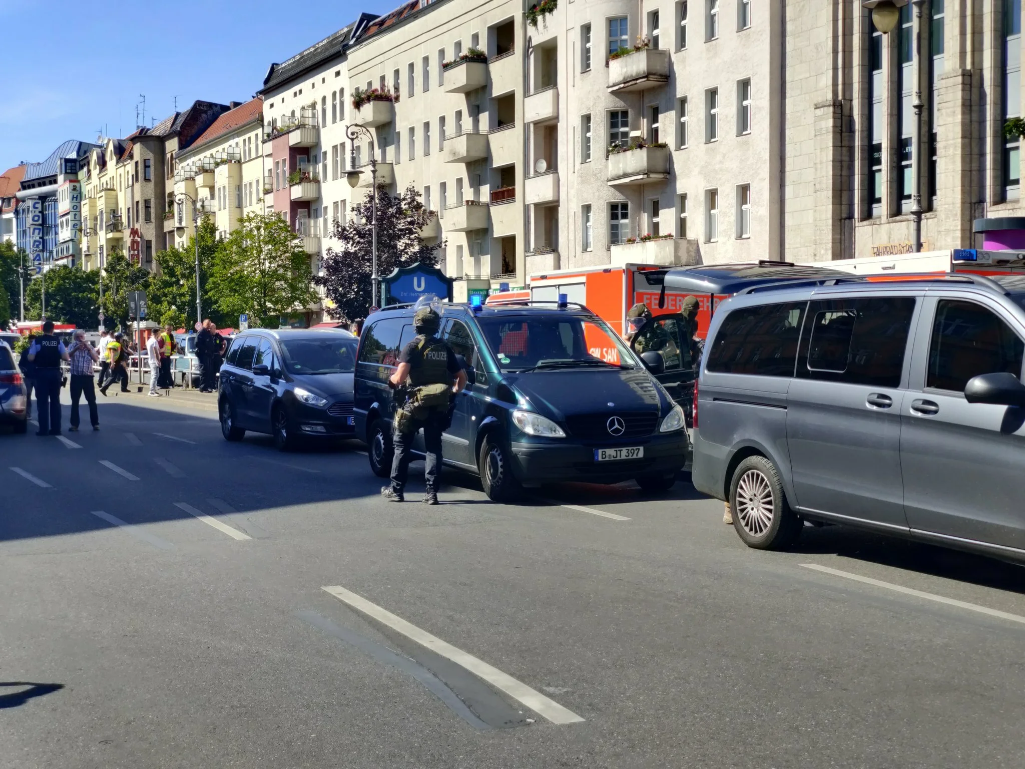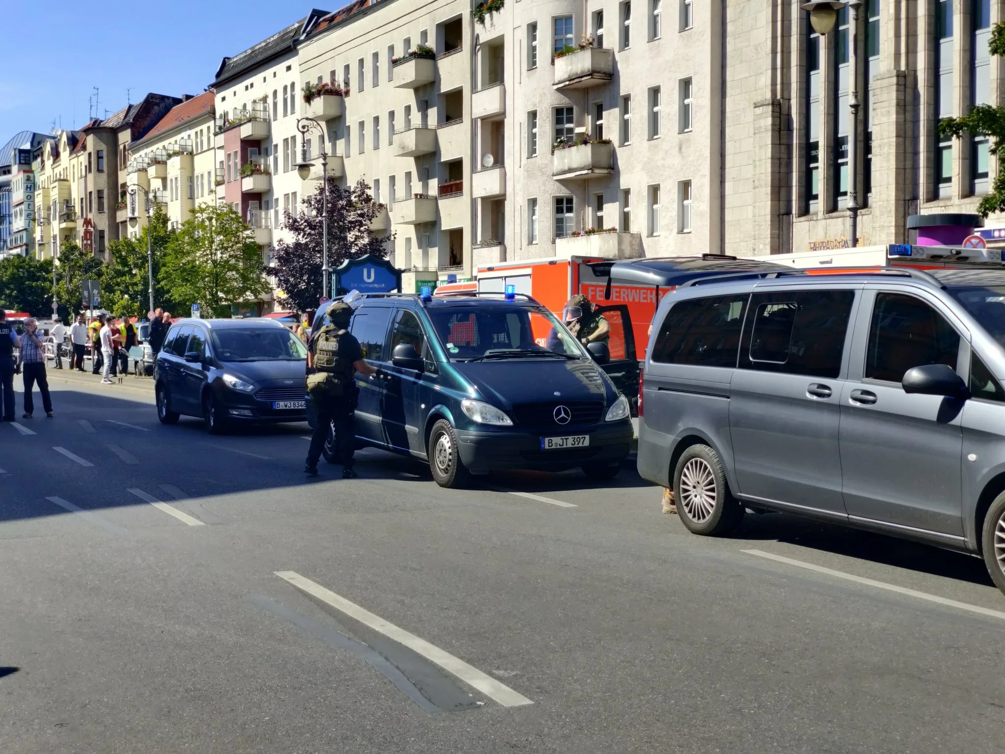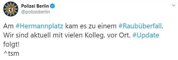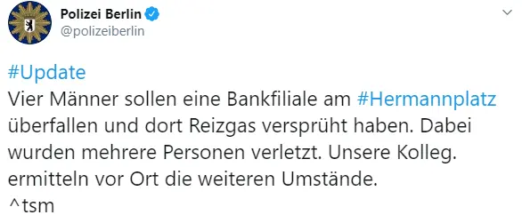 "На отделение банка на площади Херманнплатц совершили налет четверо мужчин. Они распылили там раздражающий газ, от которого пострадали несколько человек", - говорится в сообщении.