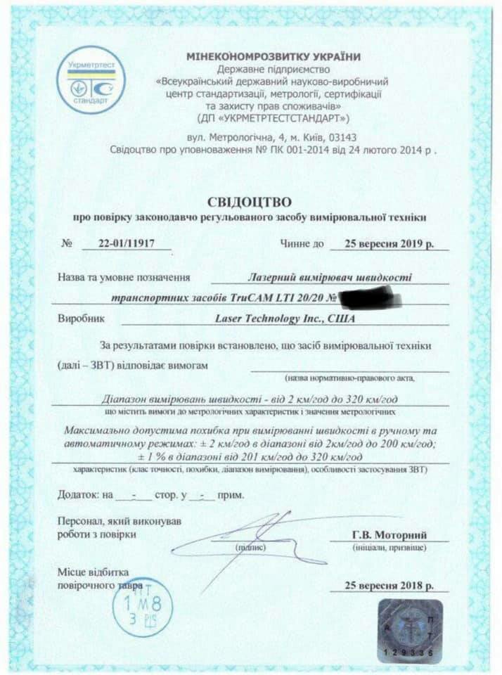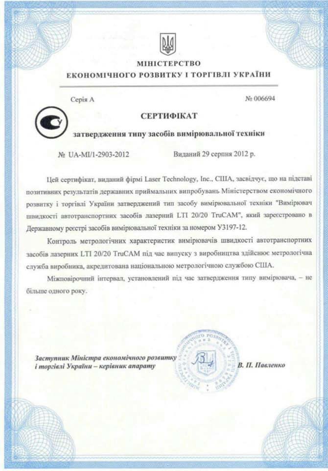 Данный прибор получил сертификат утверждения типа средств измерительной техники 29.08.2012 № UA-MI / 1-2903-2012. Соответственно, на основании положительных результатов государственных приемочных испытаний, Министерством экономического развития и торговли Украины утвержден тип измерительной техники "Измеритель скорости автотранспортных средств лазерный LTI 20/20 TruCAM", который был зарегистрирован в государственном реестре средств измерительной техники под номером У3197-12.