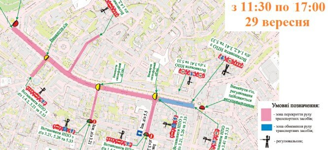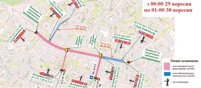 Также с 11:30 до 17:00 29 сентября (в субботу) будет дополнительно перекрыта улица Крещатик на участке от Майдана Независимости до Европейской площади, а также улица Михайловская на участке от улицы Крещатик до улицы Костельной.