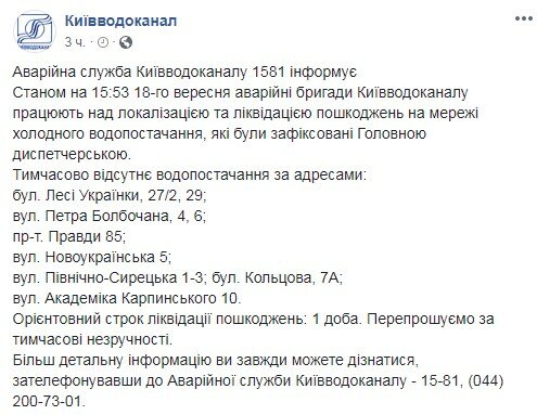 Подача холодной воды во вторник, 18 сентября, приостановлена в дома на шести улицах Киева из-за повреждения водопровода. Об этом сообщает аварийная служба "Киевводоканала" 1581 в Facebook.