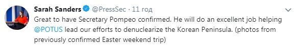 "Замечательно, что госсекретарь Помпео утвержден в должности. Его отличная работа поможет президенту в его усилиях по денуклеаризации Корейского полуострова", - указала Сандерс.