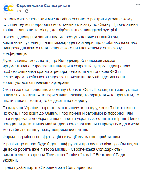 "Владимир Зеленский должен немедленно сообщить украинской общественности все подробности своего тайного визита в Оман. Эта отдаленная страна явно не является тем местом, где происходят случайные встречи", - говорится в сообщении.