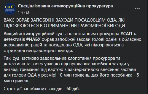 Об этом говорится на Facebook-странице Специализированной антикоррупционной прокуратуры.