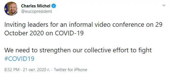 Мишель предложил лидерам присоединиться к неформальной видеоконференции, которая состоится 29 октября 2020 года.