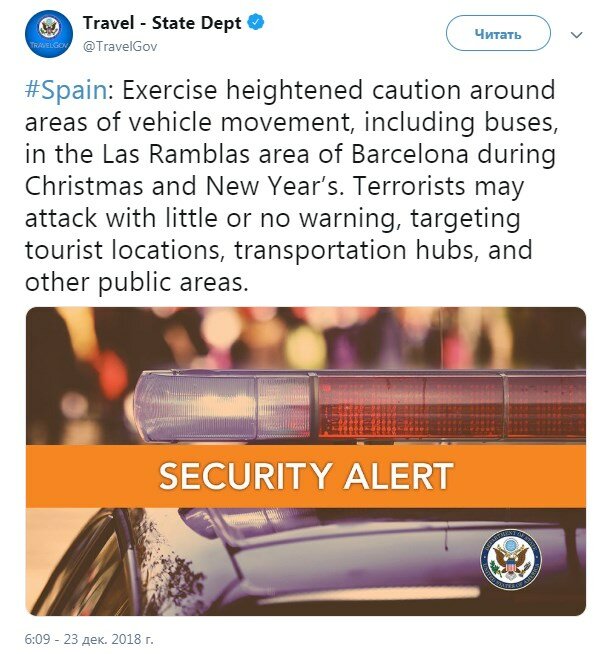 Испанцев предупредили о возможных терактах в Барселоне во время рождественских праздников. Данное заявление сделали в Государственном департаменте США, на своей странице в Twitter.