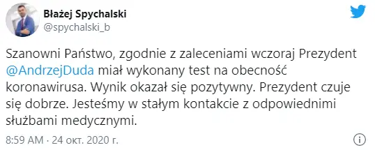 Спыхальский добавил, что сам сейчас ушел на карантин, поскольку контактировал с президентом.