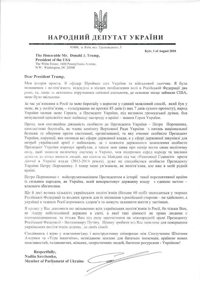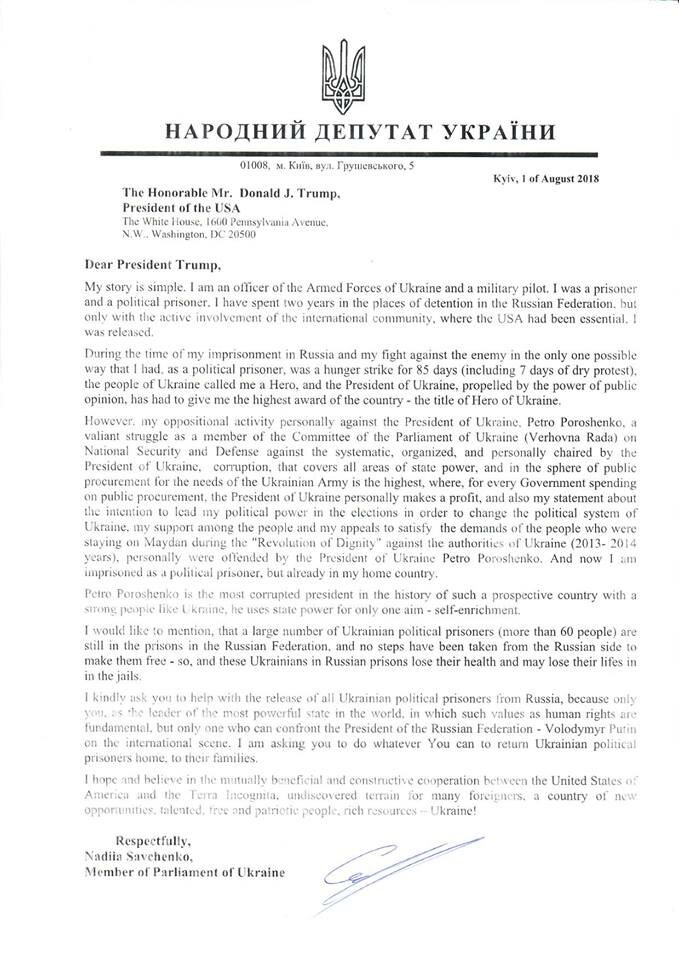 Также Савченко написала Трампу, что ее посадили в тюрьму, потому что президенту Петру Порошенко не понравилась "оппозиционная деятельность", которую ведет нардеп.