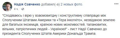 Народный депутат Надежда Савченко, которую подозревают в подготовке терактов и свержения государственной власти, написала письмо президенту США Дональду Трампу. Об этом нардеп сообщила в Facebook.