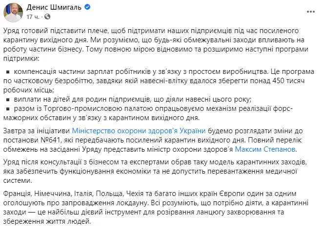 "Завтра по инициативе Министерства здравоохранения Украины будем рассматривать изменения в постановление №641, которые предусматривают усиленный карантин выходного дня. Полный перечень ограничений на заседании правительства представит министр здравоохранения Максим Степанов. Правительство после консультации с бизнесом и экспертами выбрало такую модель карантинных мероприятий, которая обеспечит функционирование экономики и не допустит перегрузки медицинской системы", - добавил Шмыгаль.