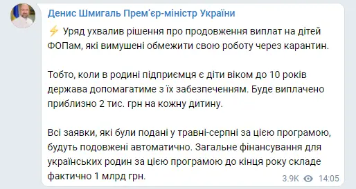 Премьер-министр Украины Денис Шмыгаль заявил, что правительство продолжит выплачивать по 2 тысячи гривен предпринимателям, у которых есть дети в возрасте до 10 лет. Об этом он сообщил в своем Telegram-канале.