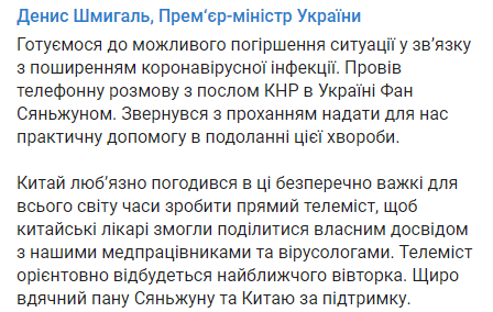 Он объяснил, что власти готовятся к возможному ухудшению ситуации с коронавирусом. На фоне этого Шмыгаль созвонился с послом Китая в Украине Фан Сяньжуном.