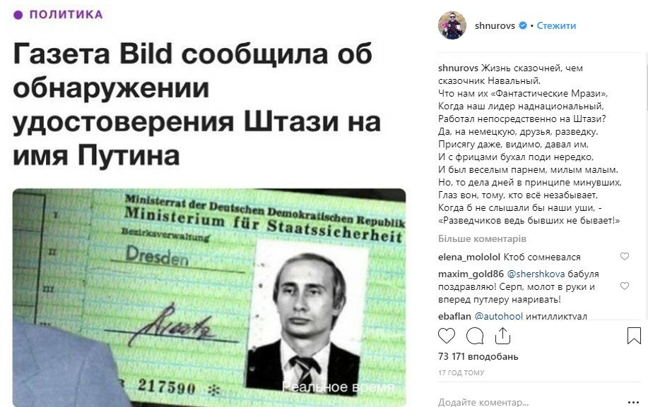 Вокалист известной российской группы "Ленинград" Сергей Шнуров написал стихотворение о президенте Российской Федерации Владимире Путине и его работе в немецкой разведке. Поводом для этого стала информация, что в архивах Штази нашли служебное удостоверение, выданное на имя майора Путина.