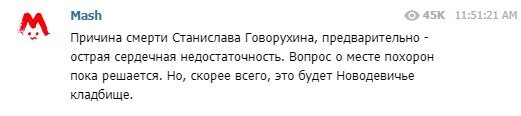 Как ранее сообщал NEWSONE, российского режиссера Станислава Говорухина в среду, 13 июня, госпитализировали в Центральную клиническую больницу Москвы. В этот день СМИ сообщили о смерти режиссера, но тогда его пресс-секретарь опровергла эту информацию. Также супруга режиссера Галина заявила, что ее муж момент чувствует себя хорошо. Она отметила, что Говорухин ни с кем не хочет разговаривать и даже находясь на больничной койке, продолжает работать. Однако 14 июня стало известно, что Говорухин скончался на 83-м году жизни.