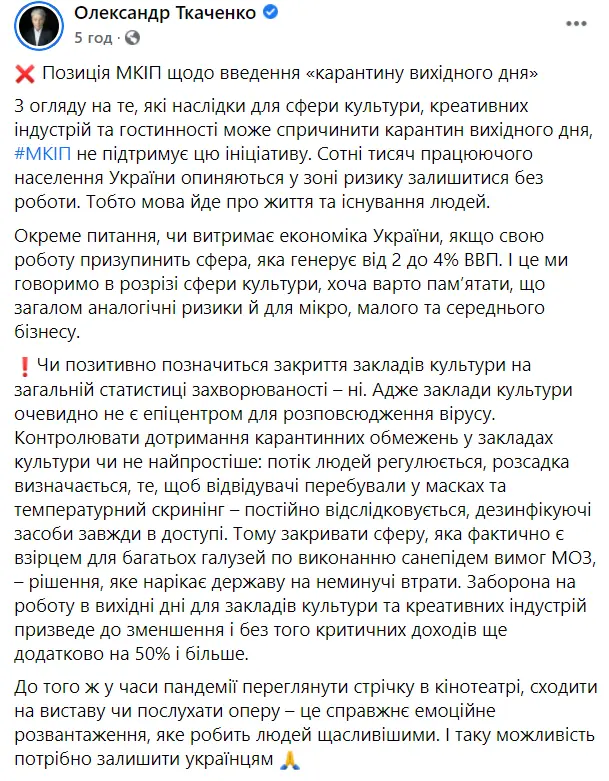 Министерство культуры Украины раскритиковало идею правительства о введении карантина "выходного дня". Об этом сообщил глава ведомства Александр Ткаченко на своей странице в Facebook.