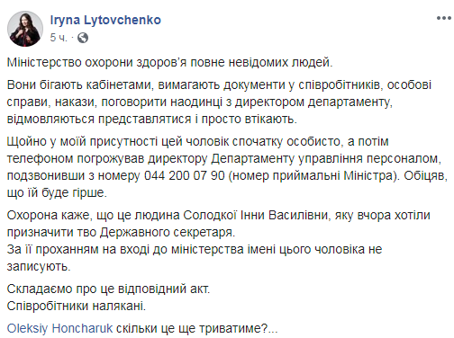 "Министерство здравоохранения полно неизвестных людей. Они бегают по кабинетам, требуют документы у сотрудников, личные дела, приказы, поговорить наедине с директором департамента, отказываются представляться и просто убегают", - написала Литовченко.