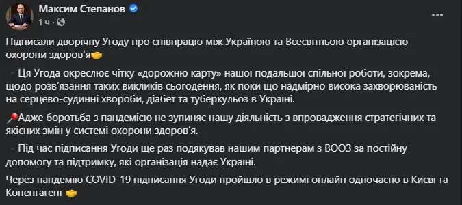 Украина и ВОЗ подписали двухлетнее соглашение о сотрудничестве