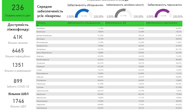 На дашбордах можно увидеть список больниц, в которых есть свободные для госпитализации места, а также их снабжение медикаментами, средствами защиты, аппаратами для искусственной вентиляции легких и другое.
