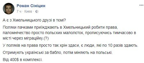 "Поляки пачками приезжают в Хмельницкий делать права, паломничество просто польских малолеток, прописываясь временно в городе через миграционку", - написал он.