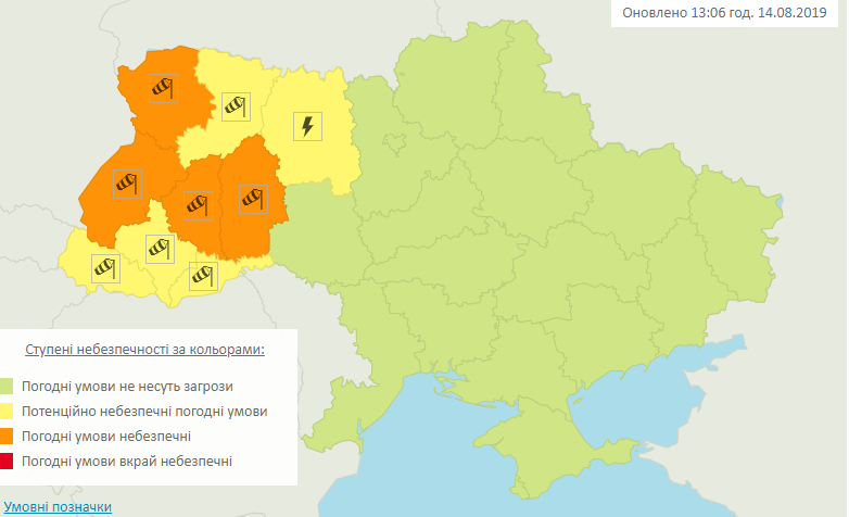 "Дожди, грозы, возможны сильные ливни, шквал и град - на Западе. Сильный, близкий к штормовому, южный ветер - на Севере, в Центре до Одесской области. Жара - на Юге, Востоке и в центральных областях, кроме Винницкой", - сообщила синоптик.