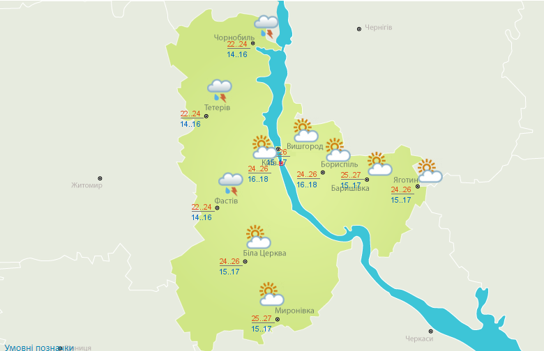 "На Востоке предполагается +30ºС +34ºС. На Западе уже будет просто холодно, +18ºС +23ºС. А вот на Севере - полная демократия: в четверг в Житомирской области +20ºС +23ºС, в Киевской области +23ºС +25ºС, в Черниговской области +25ºС +27ºС, в Сумской области +26ºС +31ºС", - пишет Диденко.
