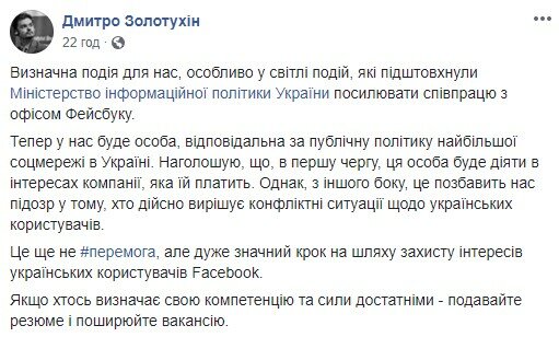 Заместитель министра информационной политики Украины Дмитрий Золотухин рассказал о позитиве для Украины в связи с открытием этой вакансии. По его словам, это избавит страну от подозрений в том, кто действительно решает конфликтные ситуации относительно украинских пользователей.