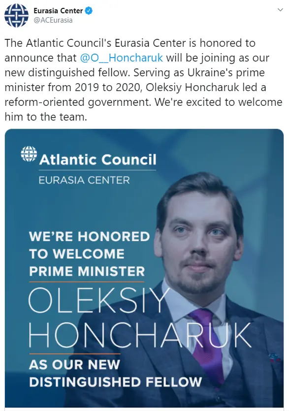 "Атлантический совет Eurasia Center имеет честь объявить, что Алексей Гончарук присоединится к нам как новый заслуженный сотрудник. Будучи премьер-министром Украины с 2019 по 2020 год он возглавлял правительство, которое было ориентировано на проведение реформ. Мы рады приветствовать его в нашей команде", - говорится в сообщении.
