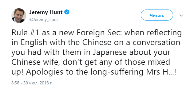 "Правило №1 для министра иностранных дел: когда вы говорите по-английски с китайцами о разговоре, который у вас был на японском языке о вашей китайской жене, не перепутайте их! Извинения перед многострадальной миссис Х…", - написал он позже в своем Twitter.