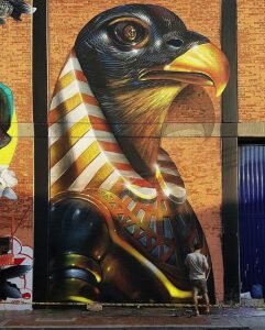 Далее в списке идут картина из Колумбии, сделанная Споком Бриллером, - изображение египетского бога Хоруса, работа литовского художника Эрнест Захаревича и его крыша для Хеллоуина и изображение цветной крысы от художника из Парижа.