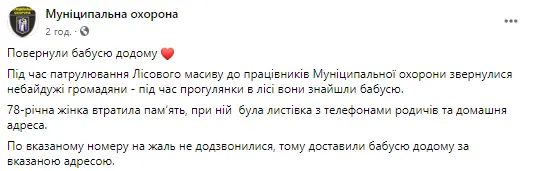По данным правоохранителей, 78-летняя женщина потеряла память. При ней обнаружили открытку с телефонными номерами родственников и адресом места проживания. Сотрудники Муниципальной стражи отчитались, что не смогли связаться по указанным номерам с родственниками пенсионерки. Они доставили бабушку домой по адресу.
