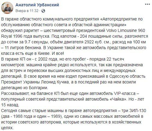 "В гараже областного коммунального предприятия “Автопредприятие по обслуживанию областного совета и областной администрации” обнаружил раритет – шестиметровый президентский Volvo Limousine 960 Royal 1996 года выпуска. В Украине такой же автомобиль представительского класса есть еще в Киеве. И все! В гараже КП он с 2002 года, но его пробег – около 22 тысяч километров: машина крайне редко используется, так как предназначена для встреч и перевозки высших должностных лиц и международных делегаций. В свое время на нем приезжал в Одесскую область президент Украины Леонид Кучма, а в последний раз на нем возили делегацию из Болгарии", - написал Урбанский.