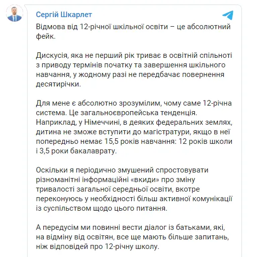 Шкарлет назвал фейком информацию об отмене 12-летнего образования в школах
