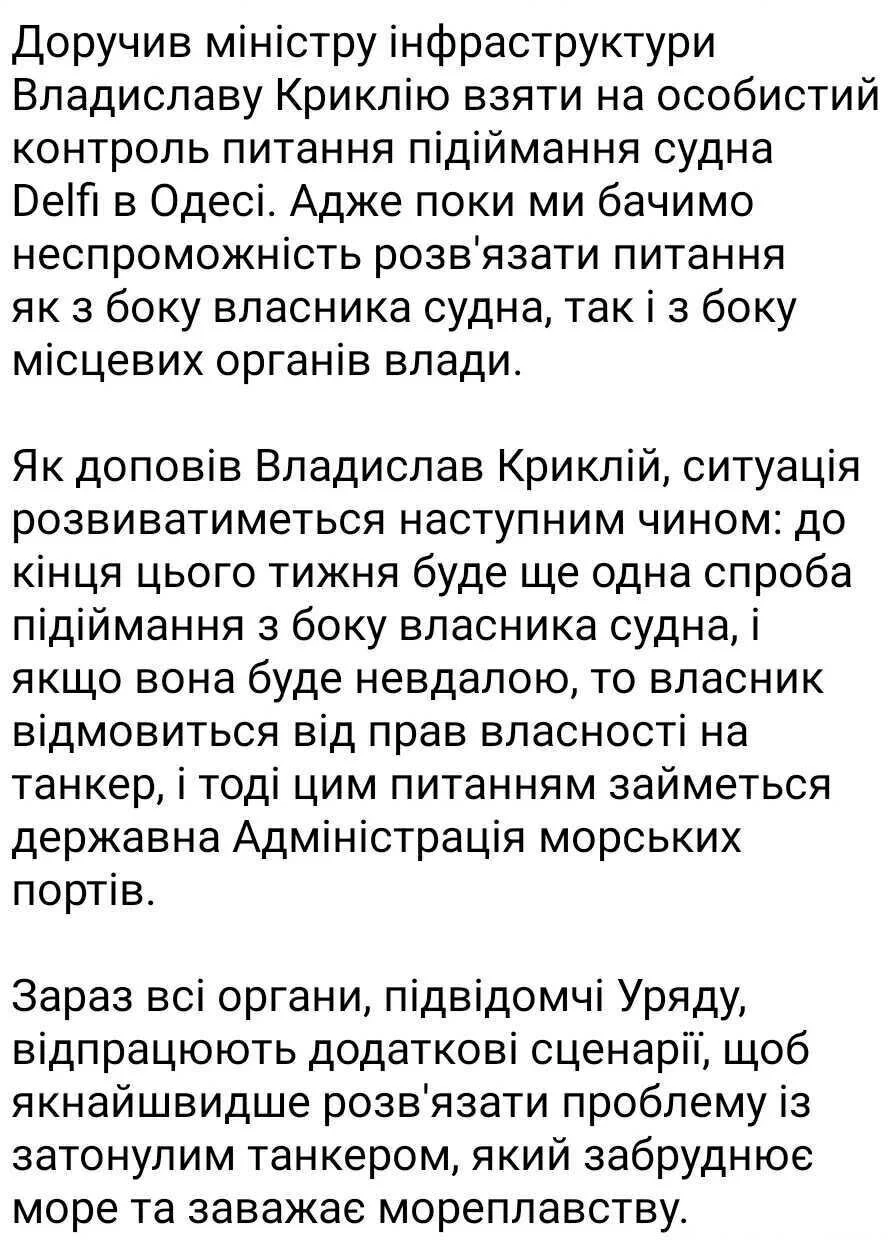 Премьер-министр Украины Денис Шмыгаль заявил, что у владельца танкера Delfi, потерпевшего крушение у побережья Одессы, есть время до конца недели, для того чтобы поднять судно.
