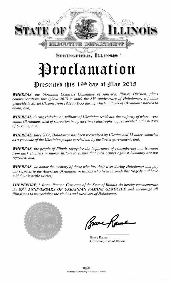 "Губернатор штата Иллинойс Брюс Раунер выдал прокламацию, которая провозглашает 2018 год годом памяти жертв Голодомора-геноцида 1932-1933 гг. в Украине, искусственно вызванного советской властью", - говорится в сообщении.