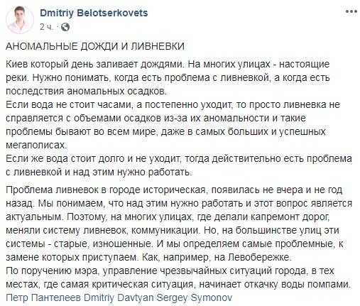 "Если вода не стоит часами, а постепенно уходит, то просто ливневка не справляется с объемами осадков из-за их аномальности и такие проблемы бывают во всем мире, даже в самых больших и успешных мегаполисах", - рассказывает он.