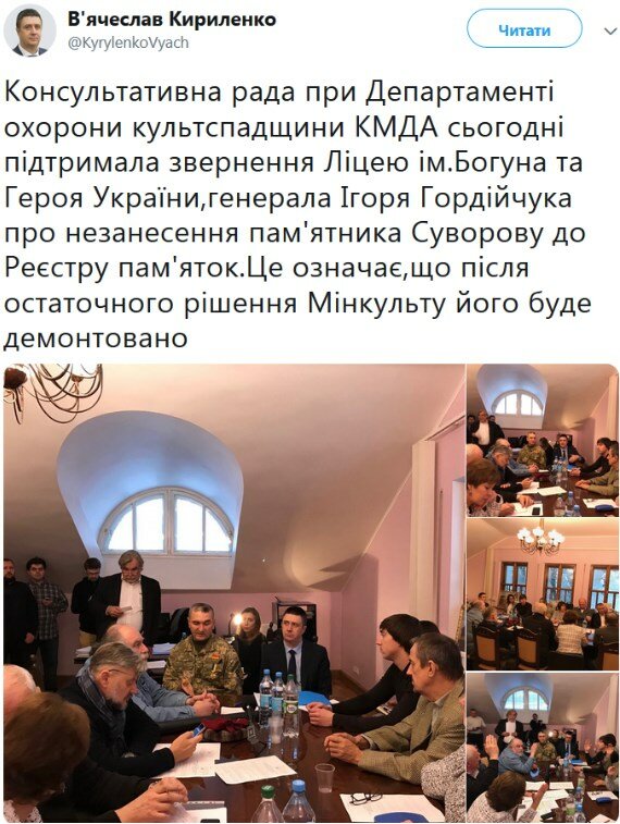 "Консультативный совет при Департаменте охраны культурного наследия Киевгосгорадминистрации сегодня поддержал обращение лицея имени Богуна и Героя Украины, генерала Игоря Гордийчука о незанесении памятника Суворову в реестр памятников. Это означает, что после окончательного решения Минкульта он будут демонтирован", - написал чиновник.
