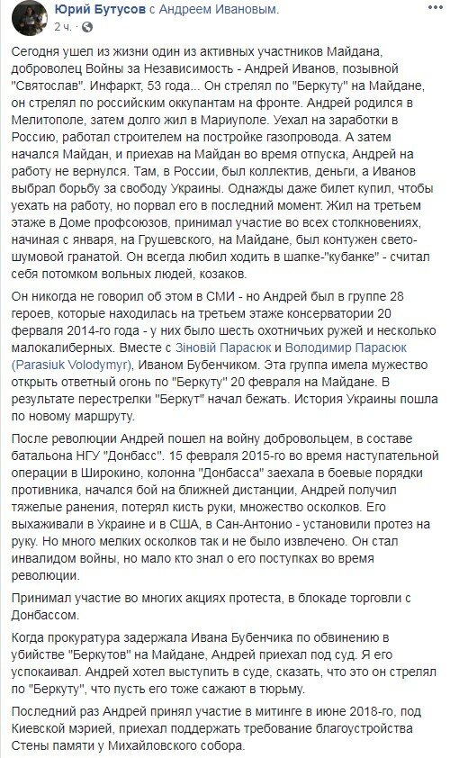 "Андрей родился в Мелитополе, затем долго жил в Мариуполе. Уехал на заработки в Россию, работал строителем на постройке газопровода. А затем начался Майдан, и, приехав на Майдан во время отпуска, Андрей на работу не вернулся. Там, в России, был коллектив, деньги, а Иванов выбрал борьбу за свободу Украины. Однажды даже билет купил, чтобы уехать на работу, но порвал его в последний момент. Жил на третьем этаже в Доме профсоюзов, принимал участие во всех столкновениях, начиная с января, на ул. Грушевского, на Майдане, был контужен свето-шумовой гранатой. Он никогда не говорил об этом в СМИ - но он был в группе 28 героев, которые находилась на третьем этаже консерватории, у которых было шесть охотничьих ружей и несколько малокалиберных. Вместе с Зиновием и Владимиром Парасюками, Иваном Бубенчиком. Эта группа имела мужество открыть ответный огонь по "Беркуту" 20 февраля на Майдане. В результате перестрелки "Беркут" начал бежать. История пошла по новому маршруту", - написал журналист.