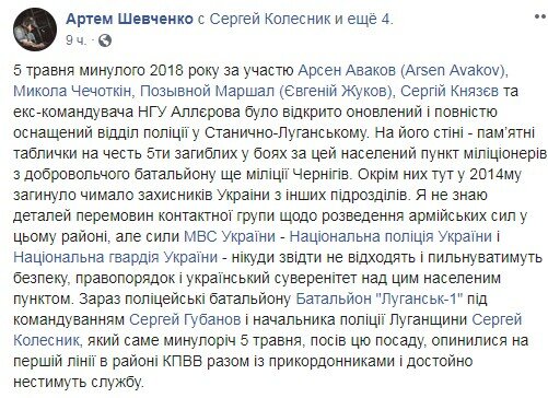 "Я не знаю деталей переговоров контактной группы по разведению армейских сил в этом районе, но силы МВД Украины – Национальная полиция и Национальная гвардия – никуда оттуда не уходят и будут следить за безопасностью, правопорядком и украинским суверенитетом над этим населенным пунктом. Сейчас полицейские батальона "Луганск-1" под командованием Сергея Губанова и начальника полиции Луганской области Сергея Колесника, который 5 мая занял эту должность, оказались на первой линии в районе КПВВ совместно с пограничниками и достойно будут нести службу", – подытожил Шевченко.