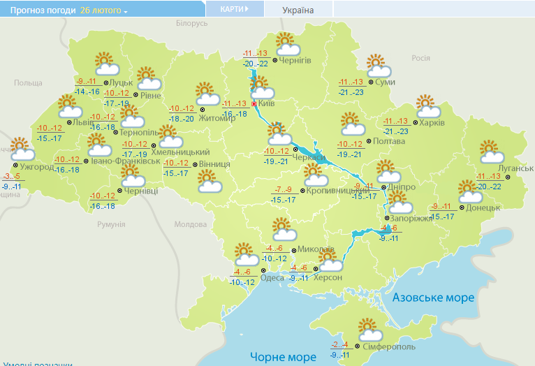 В субботу 24 февраля, днем -5...-10. Снег продолжит идти. А с 25-26 февраля в Украине снег прекратится, ожидается похолодание до -10...-13 днем и -15...-18 ночью.