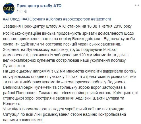 "Российско-оккупационные войска продолжают срывать договоренности о полном прекращении огня на период Пасхальных праздников. С начала суток оккупанты провели 14 обстрелов позиций украинских защитников", – сказано в сводке.