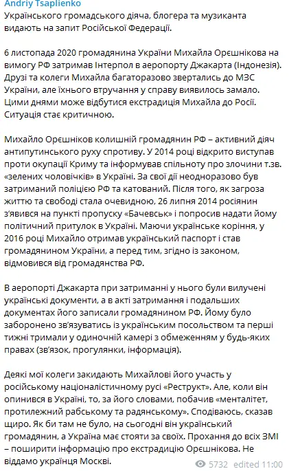 Украинский журналист Андрей Цаплиенко заверил, что блогер и музыкант Орешников отказался от российского гражданства согласно всех процедур. Об этом он сообщил в своем Telegram-канале.