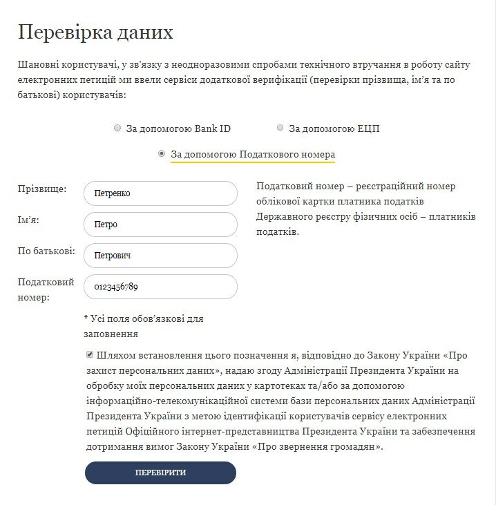 Заполняем требуемые поля по примеру на картинке выше, ставим галочку об использовании персональных данных и нажимаем кнопку “Перевірити”.